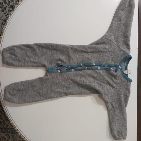 Nøstebarn ull dress i størrelse 86, farge grå, designet for barn og unisex bruk. Laget av ullmateriale som gir varme og komfort. Buksen har fått en dreining i stoffet, slik at buksen blir skjev.