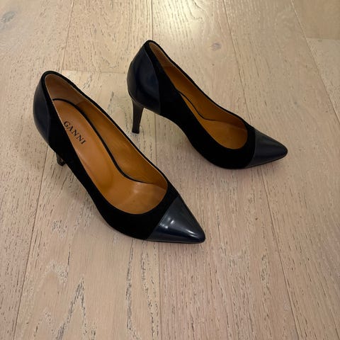 Ganni pumps i størrelse 37 laget av burgunder semsket skinn. Skoene har en spiss tupp og en lav hæl.