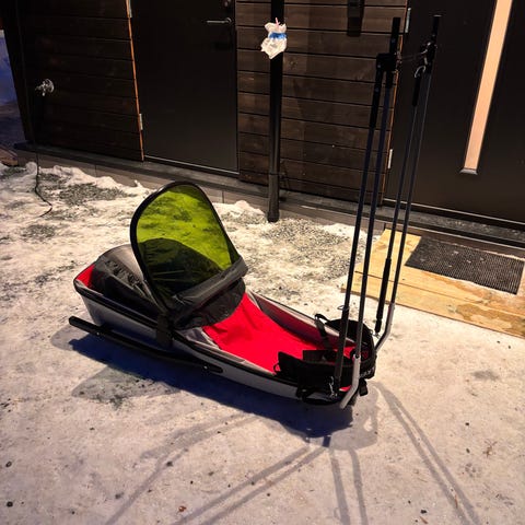 Pulk i god stand selges. Denne har mørk skjerm, noe vi synes er veldig gunstig med tanke på at det fort kan bli sterk sol for barna baki.