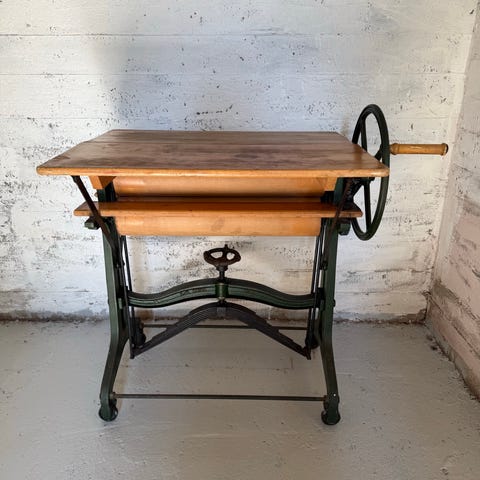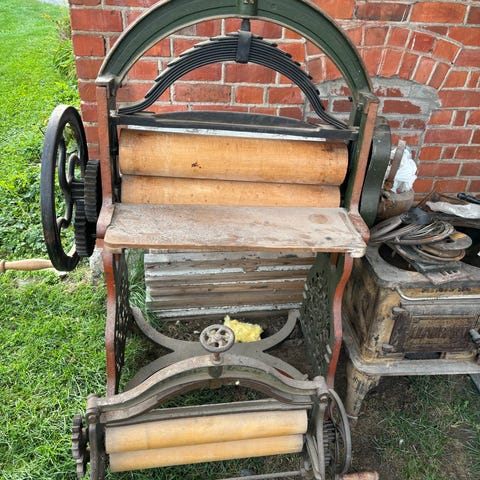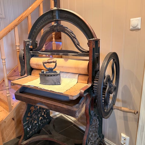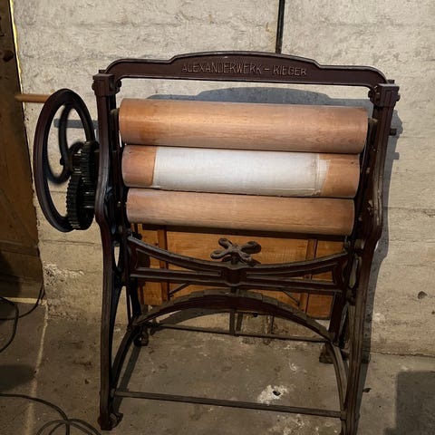 Antikk klesrulle med håndsveiv, treskive og støpejernsramme. Designet for manuell bruk, egnet for tradisjonell klesvask. Har en solid konstruksjon med detaljer i metall og tre. Alt er intakt og virker.