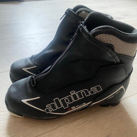 Alpina skistøvel i størrelse 33 med blå farge. Støvelen har borrelås- og spennesystem for justering og god passform. Innvendig fôr for komfort og varme. Selges 100,-