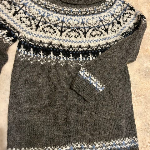 Håndstrikket i Álafosslopi som er spunnet av både underull og dekkhår, noe som gjør genseren vannavstøtende, varm og god på, slitesterk og holdbar.