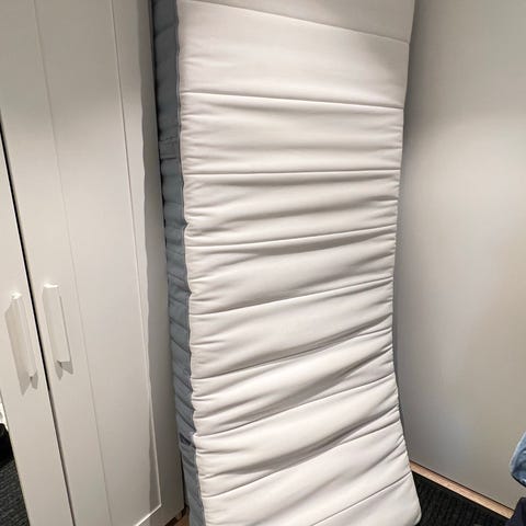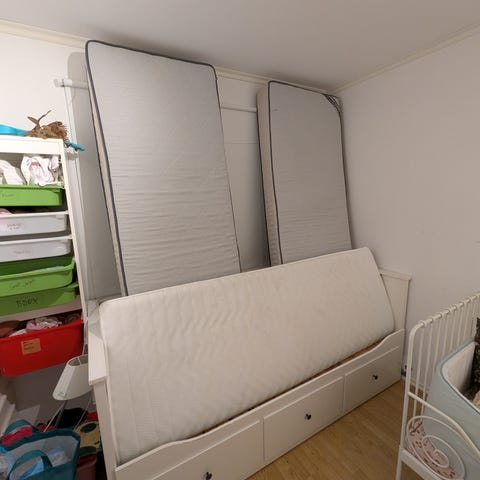 IKEA Hemnes dagseng i pen, brukt stand. Har kun vært brukt som gjesteseng. Normal bruksslitasje. Madrasser følger i utgangspunktet ikke med, men kan selges med to madrasser i størrelse 200 × 80 cm og en overmadrass i str 200x150..