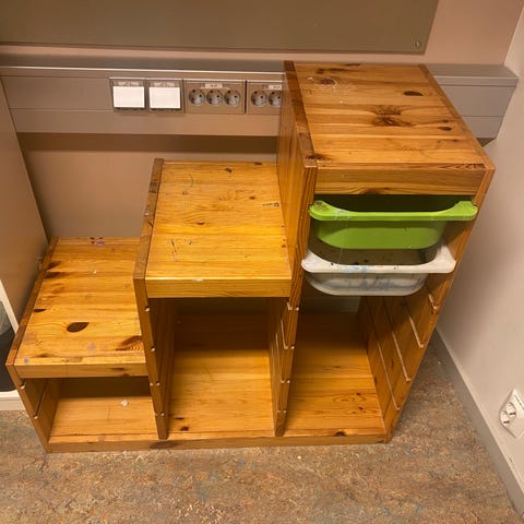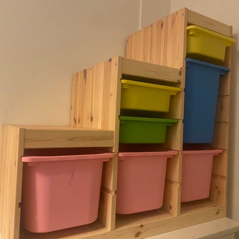 Systemet består av rammer med flere oppbevaringsbokser i ulike størrelser og farger. Egnet for organisering og oppbevaring i barnerom.