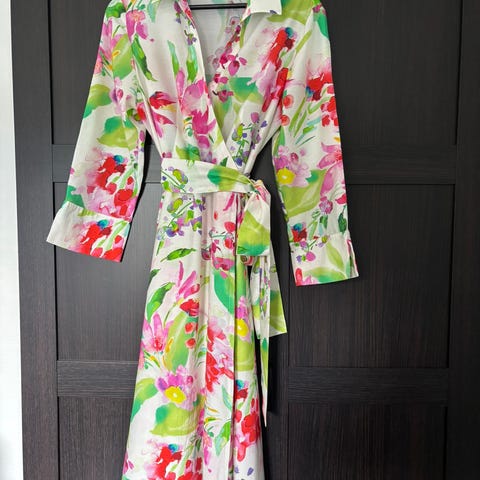 Lekker flanell morgenkåpe med store rose motiver. Laget i bomull og føles god og varm ut, perfekt til kalde morningen mens man ser stilig ut samtidig. Usikker på hvor gammel men antageligvis 70 eller 80 tallet. I veldig god stand tatt alder i betraktning. Står str46 på lappen men det virker som den er nærmere str44/xl.