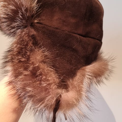 Tror det er pels lue. Står ikke noe i den. Rå er den uansett. Denne blir du virkelig lagt merke til i og i tillegg er den veldig god og varm. Som ny.