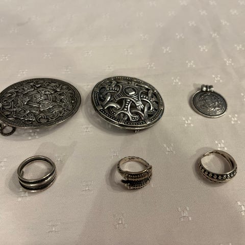 Smykke med et norrønt eller vikingsk design med sammenflettet dyreform (slange eller drage) og tre små, runde plater hengende fra bunnen. Smykket har slitasje og patina.