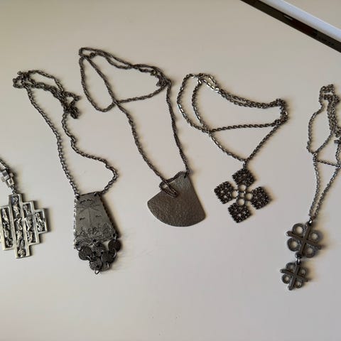 Et sølvfarget halskjede med anheng med lykkesymboler som hjerte, hestesko, nøkkel og telefon. Smykker er fra 1960-1970. Det står stempel på skjede 800. Lengde på skjeden er 70 cm.