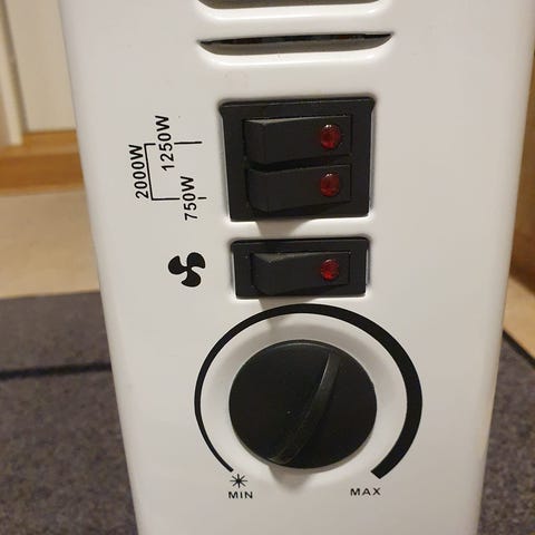 Mill Panelovn i hvit farge med digital kontrollpanel. Panelovnen har et moderne design med svart frontpanel og hvit ramme. Den er utstyrt med justerbar termostat for temperaturkontroll. Passer for oppvarming av rom i hjemmet eller kontoret.