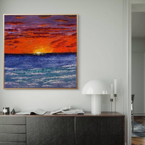 Maleri som viser et havlandskap med bølger, solnedgang og skyer. Bildet har en fargepalett bestående av blå, oransje og grå toner. Passer som dekorasjon for hjem eller kontor.