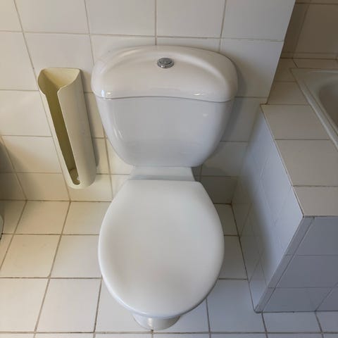 Selger et gulvmontert toalett med sisterne og lokk. Toalettet er godt brukt, men i hel og funksjonell stand, en liten sprekke på bakside som er limt fast igjen. Har stått lagret en stund, så det trenger en vask før bruk.