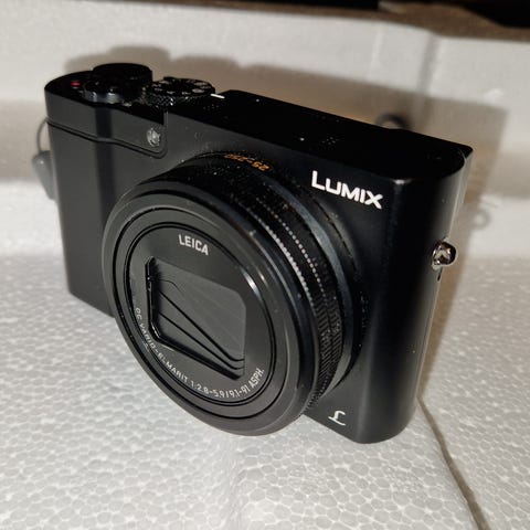 Dette er en kompaktkamera fra Panasonic Lumix. Veske, biltslys, stativ, batter, lader og to minnekort følger med. Det er et bra kamera som tar fine bilder og tar lite plass.