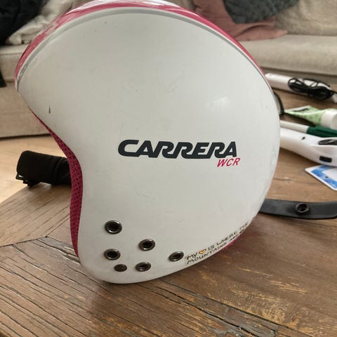 Carrera skihjelm i svart og gul farge. Hjelmen har justerbar stropp under haken for sikker passform. Designet for å gi beskyttelse ved vintersportaktiviteter.