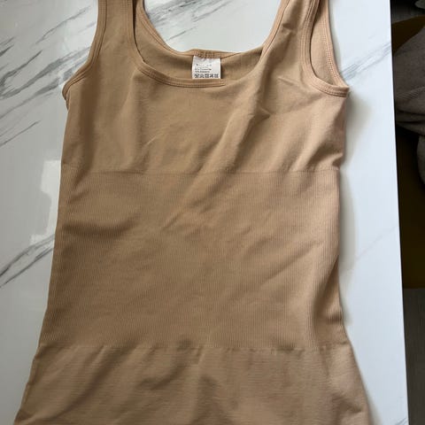 Tanktopp/shaper i beige farge laget av nylonmateriale. Toppen er i størrelse M og designet for kvinner med brystinblegg/kan tas ut. Ikke brukt