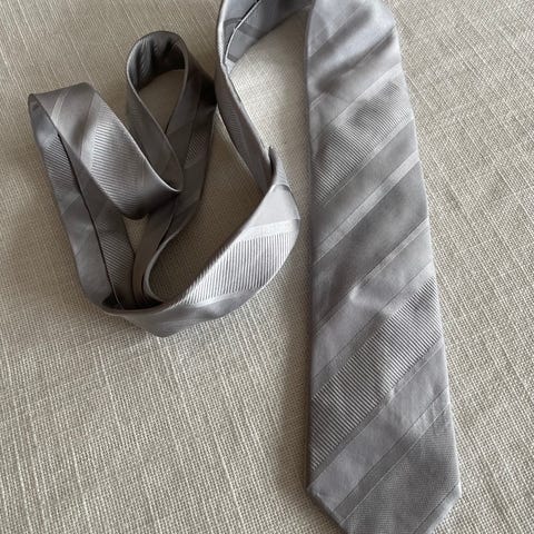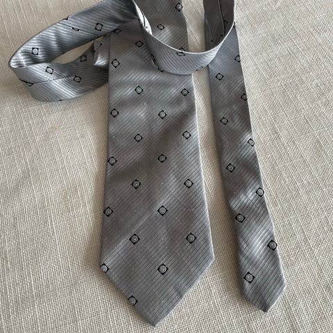 Slips i silke fra Vincent. Svart grunnfarge med lys beige og firkantede mønstre og detaljer. 9,3 cm på det bredeste. Kan hentes i Oslo eller sendes. Kjøper betaler porto.