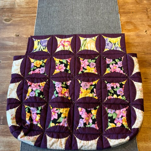Lappeteknikk, stjerneduk i gul/grønn yoner med gammelrosa kant rundt.