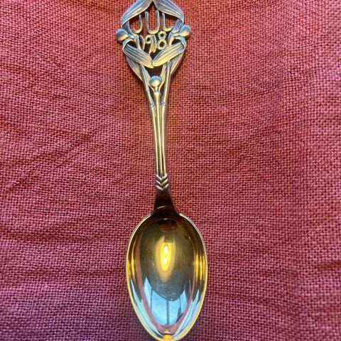 Nydelig juleskje fra A. Michelsen. 1915. Motiv ‘Hellig tre konger.’ Tegnet av Harald Slott-Møller. Forgyldt sterling sølv. L 16 cm.