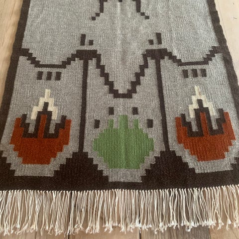 Pen håndvevd ullduk i tradisjonelt nordisk mønster, vevd i ull naturmaterialer og med flotte detaljer. Duken har et harmonisk fargespill i blått, grått, rødt, oker og naturhvitt, som gir et varmt og autentisk uttrykk.