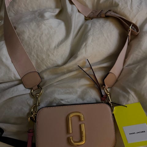 Marc Jacobs snapshot veske laget av lær i rosa farge selges. Sølvfarget på undersiden. Vesken har en rektangulær form med glidelås og dekorative detaljer i metall. Passer til daglig bruk og ulike anledninger.