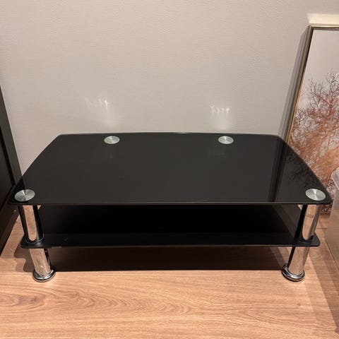 TV-benk i sort herdet glass med runde aluminiumssøyler og 2 hyller + topp