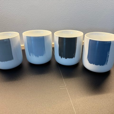 Fint sett. Inkluderer 4 fat, skåler i sett med ulik størrelse, og to kaffekopper. Hakk på fat (se bilde) ellers i god stand.