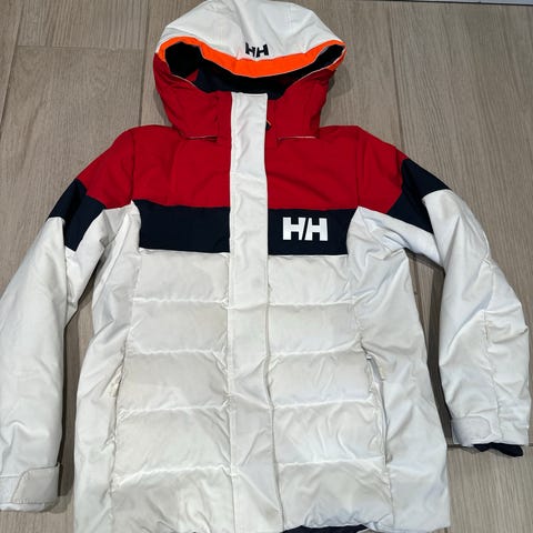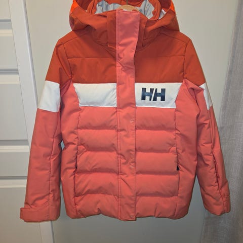 Helly Hansen vinter/alpinjakke i størrelse 128, varm dunjakke. Avtagbar hette, innerlomme, lomme til skikort og frontlommer med glidelås.