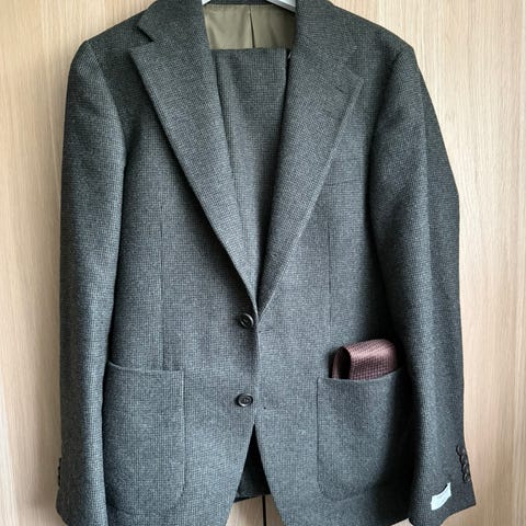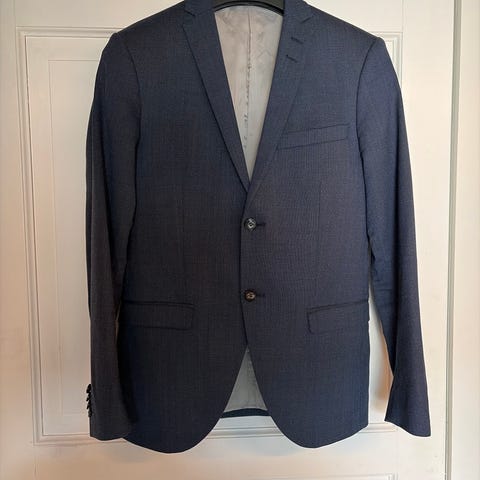 Tiger of Sweden dressjakke og bukse i grå ull, herrestørrelse 46. Dressjakken har to knapper og klassisk snitt, mens buksen har tilsvarende materiale og farge. Passer til formelle anledninger og kontorbruk.