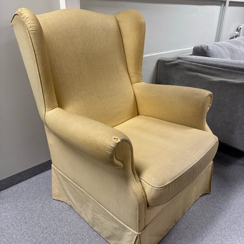 Stolen er godt brukt og har synlig slitasje og flekker. Til tross for dette er den solid, fullt funksjonell og komfortabel å sitte i.
