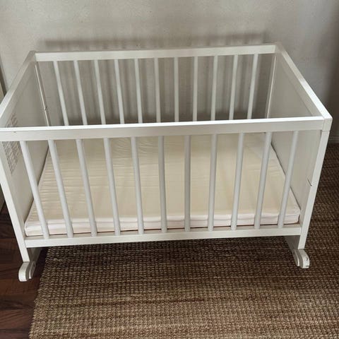 Selger en pent brukt seng fra Stokke med madrasser og sengekant. Dette er sengen som vokser med barna. Egnet fra nyfødt til 5 år. Sengekant er i lys rosa farge