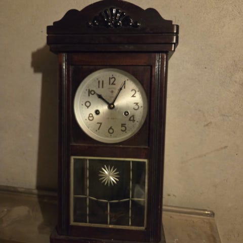Veggur i tre med pendel. Klokken har rund urskive med arabiske tall og viser tiden med to visere. Uret har en glassdør med dekorative mønstre og en pendel som svinger under urskiven. Leveres med nøkkel for opptrekking. Passer for veggmontering.