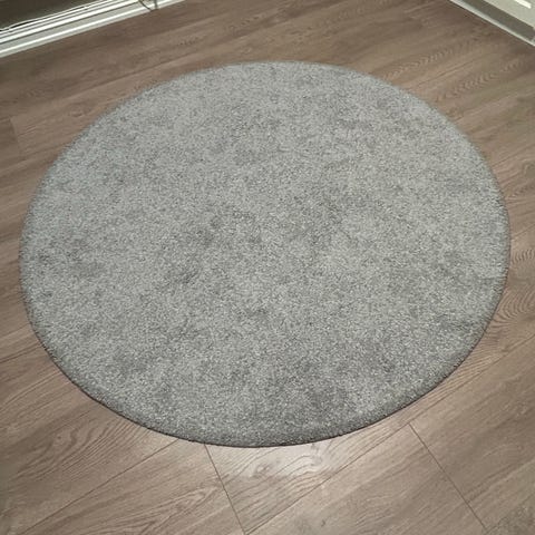 rundt teppe laget av 100% bomull. Teppe har en fargedesign i blått, hvitt og turkis med sirkulære mønstre. Passer til bruk som gulvteppe i ulike rom.