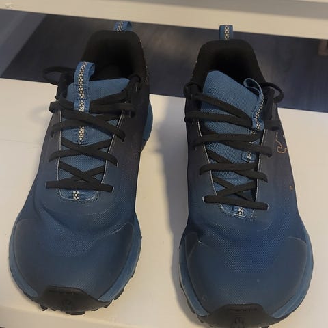Skoene er brukt, men godt ivaretatt, og alle pigger er intakte. De har god demping og er komfortable for turer eller løpeturer på glatt underlag.