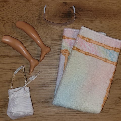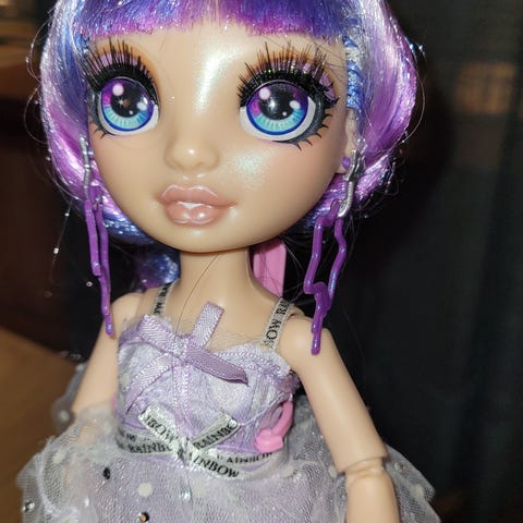 Det som er på bilder følger med. Alle klær og tilbehør er uten flekker og skader. Dukken er i veldig fin stand.
