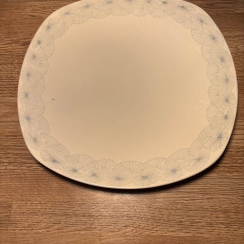 Stor serveringsskål designet av Kari Nyquist for Stavangerflint. Har hatt et skår som er fylt på kintsugi-måten: tettet og malt over med gullakk. Annet enn det framstår skålen i fin stand.