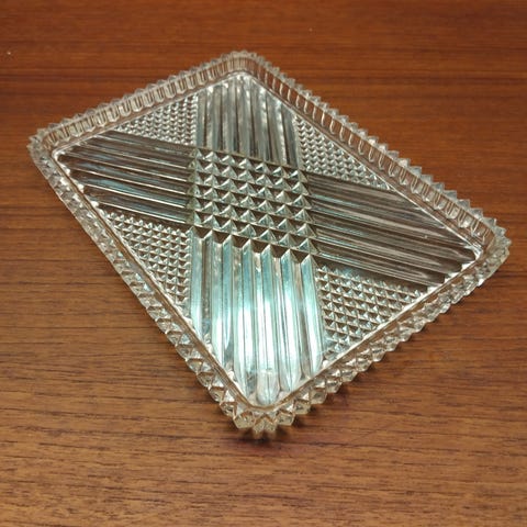 Transparsnt prest glass serveringsfat med tre separate rom og handtak , dekorert med blomstermønster (bilde) og egnet for servering av småretter eller snacks.