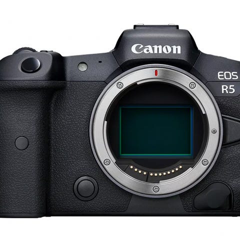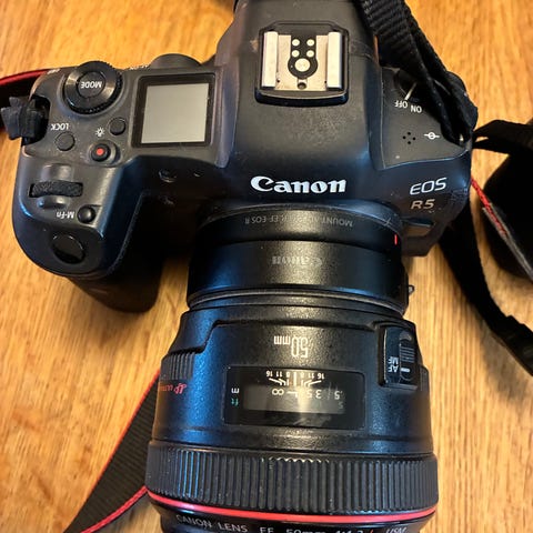 Canon EOS R5 Digital kamera. Kamera er en digital speilløs modell med høy oppløsning og avanserte funksjoner for fotografering og videoopptak. Kameraet har en vridbar skjerm for fleksibel visning og kontroll. Noe slitasje er synlig på kamerahuset.