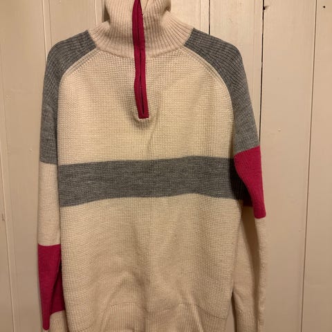 Ulvang genser i ull for kvinner, størrelse L. Genseren har grå farge med mønster og røde detaljer, inkludert glidelås og krage. Materialet er ull, egnet for varme og komfort.