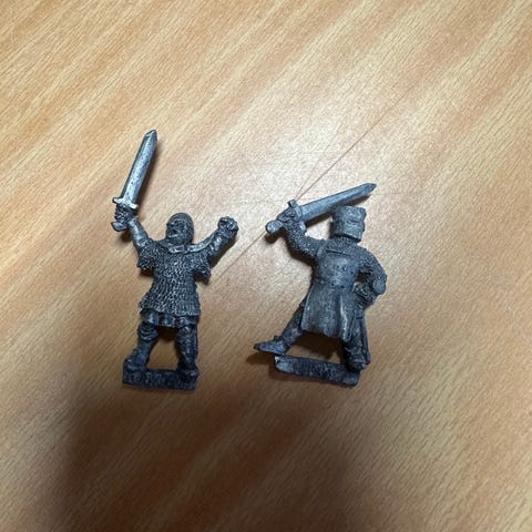 Metallfigur med sverd, umerket produsent. Figuren er laget i metall og viser en karakter med sverd i hånden. Ingen ytterligere informasjon om størrelse, materiale eller opprinnelse tilgjengelig.