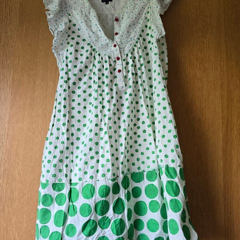 Kjole fra den japanske designeren TSomori Chisato. Sorte brede skulderstropper med strass, bærestykket som er 46 cm bredt er i fløyel. Mønsteret er formet som trær, der skikkelser titter fram. Fargen går i sort, plomme, lys svak rosa, creme og lys beige. Skjørtelengde er i 100% silke og foret.Hel lengde er 105 cm.