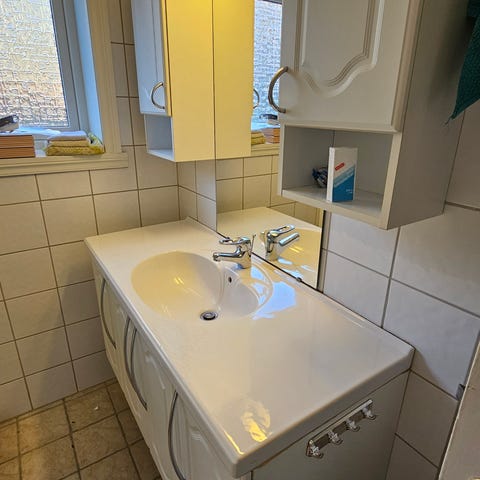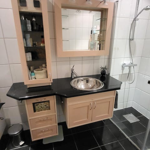 Selger pent brukt baderomsmøbel med to skuffer, inkludert servant og kran. Skuffene har soft-close funksjon, som fungerer utmerket. Fargen er mørk grå.