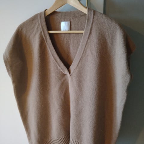 Vest med V-hals og dropped shoulders. Vesten er oversized og rett i fasongen med en liten splitt i hver side. Passer superfint over en skjorte med krage eller en t-skjorte. Kan også brukes over en kjole på litt kjølige sommerdager. Denne er kalt en waistcoat. Den er så fin og deilig. 90% myk ull og 10% cashmere. Den er så myk at du kan ha den rett på huden og det har jeg brukt min til i hele sommer. Fin på vinter også over tynn ullgenser eller skjorte. Utrolig herlig plagg. Absolutt et av mine favorittplagg.