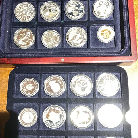 Samling av medaljer fra Torino 2006 Olympic Winter Games. Inneholder flere medaljer med ulike motiver, presentert i et oppbevaringsetui. Medaljene er sølv med stempler 925 og 999. Passer for samlere og de som er interessert i OL-minner. Total rent sølv 396 gram.
