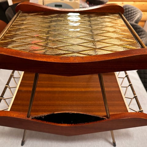 Veldig kult sidebord/stuebord av teak. Naturlige detaljer. Pent brukt!