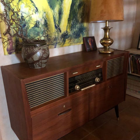 Teak skap, jeg har brukt det som barskap, men det ble vel i sinn tid solgt som sølvtøyskap.