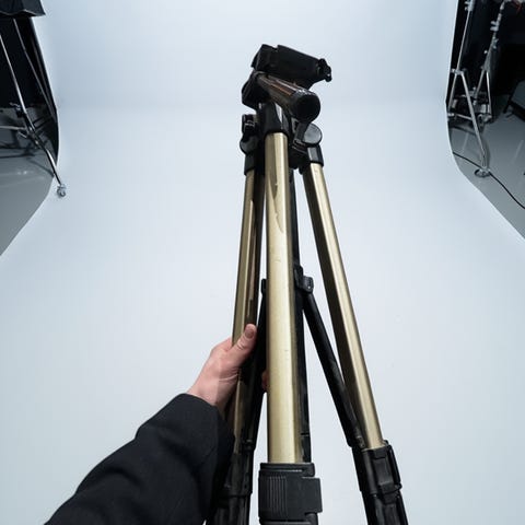 Stativet har en hurtigkoblingsplate for kamera, håndtak for panorering og justering, samt låsemekanismer for bena.