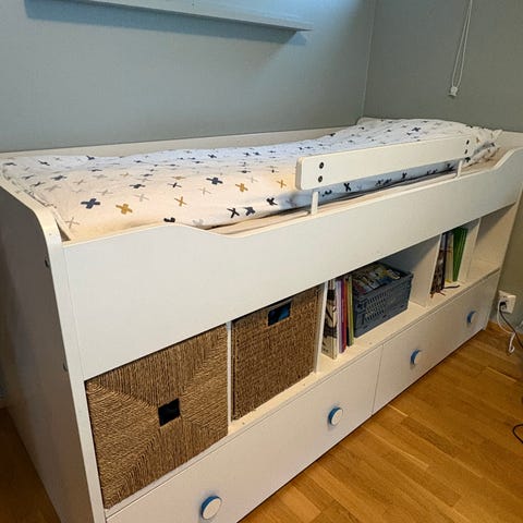 Selger flott junior køyeseng i god kvalitet. Tilvirket i heltre hos snekker. Kan blir til 2 enkeltsenger. Stige er flyttbar. Ferdig demontert og madrasser følger med. Må hentes.