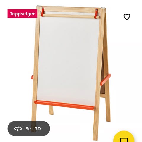 IKEA barnestaffeli i tre med hvit tavle. Staffeliet har mål på 112cm i høyde, 66 cm i bredde og 48cm i dybde. Den har to sider med tavle, en for kritt og en for tusj, og er utstyrt med en papirholder. Passer for barn og kan brukes til tegning og maling.
