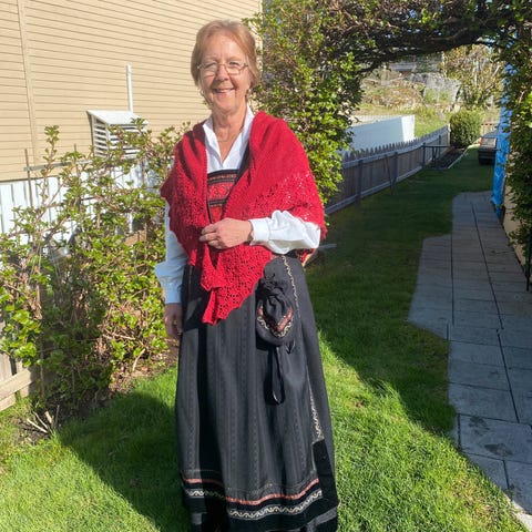 Ca 15år gammel. Brukt 4-5 ganger. Oppbevart i festdraktpose. Skjorte, cape, veske, 1 sølje og øredobber medfølger. Sølje og øredobber må pusses. Ca 138cm lang. Ikke sydd ut/inn men skal være mulig.