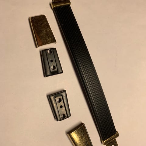 Forsterkerhåndtak i brunt kunstskinn. Lengde 22,5 cm, største bredde 22 mm. Avstand mellom skruehull i montering braketter 35 mm.
