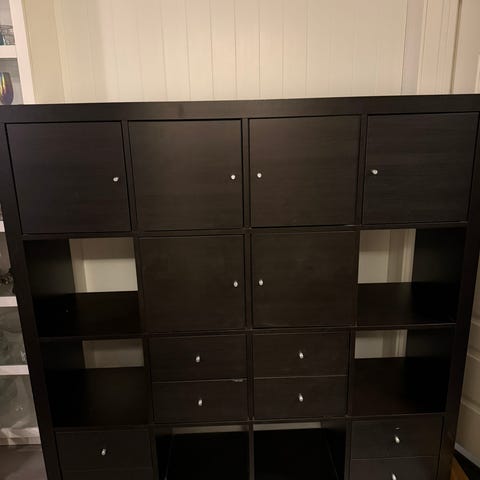Pent brukt hvit Kallax/Expedit 5x5 hylle selges. Inkluderer fire skapinnsatser og tre lamper.